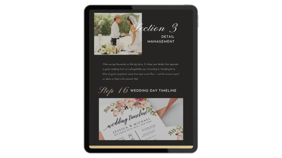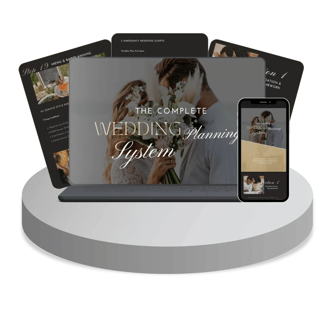 Get our proven 27-step system that's helped hundreds of couples create stunning weddings while keeping thousands in their pocket.